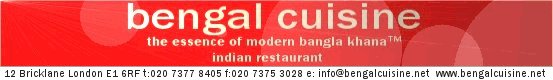 Bengal Cuisine Open 7 days a week 12 noon to midnight Opened in 1998 and refurbised in 2001.Now established as one of Londons finest restaurants serving Indian and Bangladeshi Cuisine